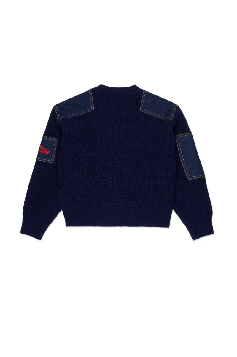 Pullover girocollo in misto lana lavorato a coste con inserti in denim. Sulle maniche risalta una patch con logo Icon New Generation ricamato in contrasto colore. Perfetto per creare look casual originali.