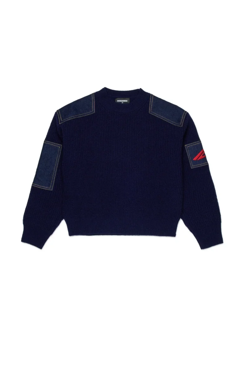 MAGLIONE BLU CON INSERETI IN DENIM CON LOGO ROSSO ICON DSQUARED2