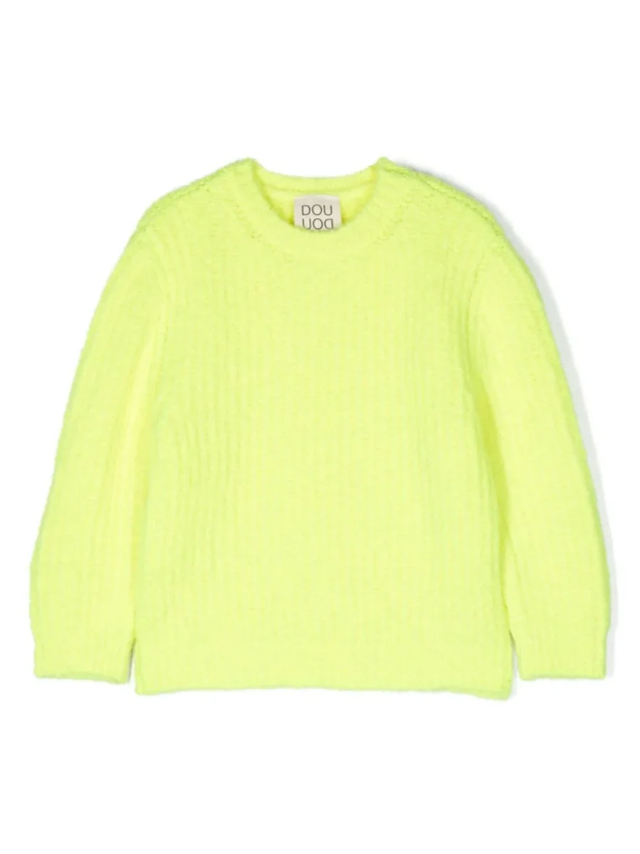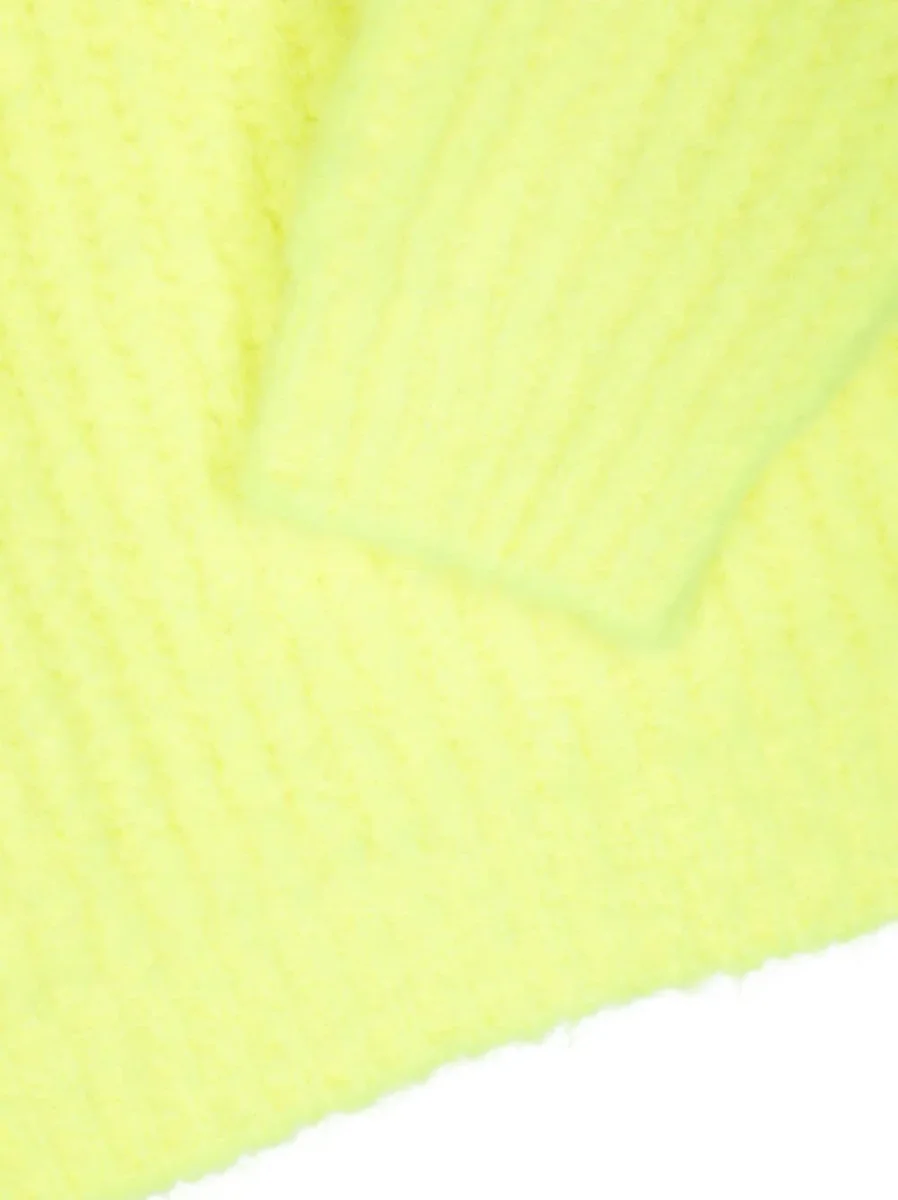 Giallo fluorescente, design lavorato a maglia, girocollo, maniche lunghe e orlo dritto.