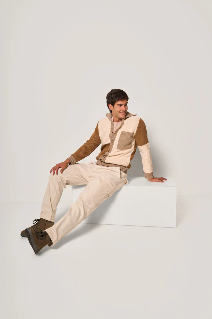 Maglione in maglia pesante dal design color block, perfetto per un look casual e contemporaneo. Il modello presenta una chiusura con bottoni, taschino applicato sul petto e colletto alto che aggiunge un tocco moderno e versatile.