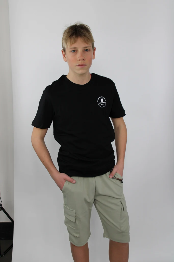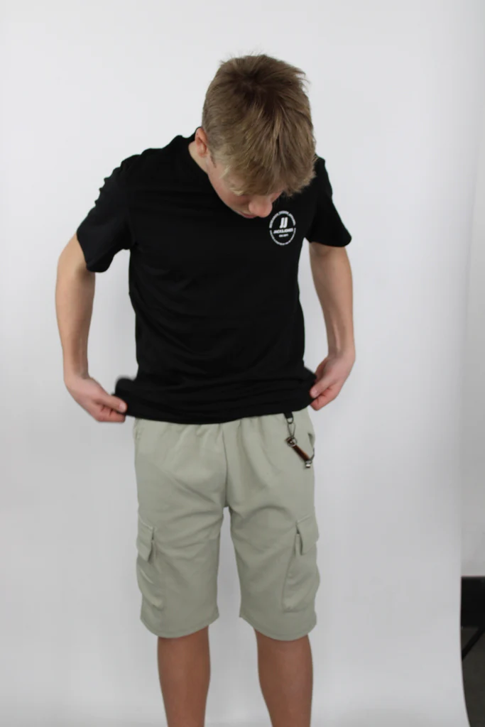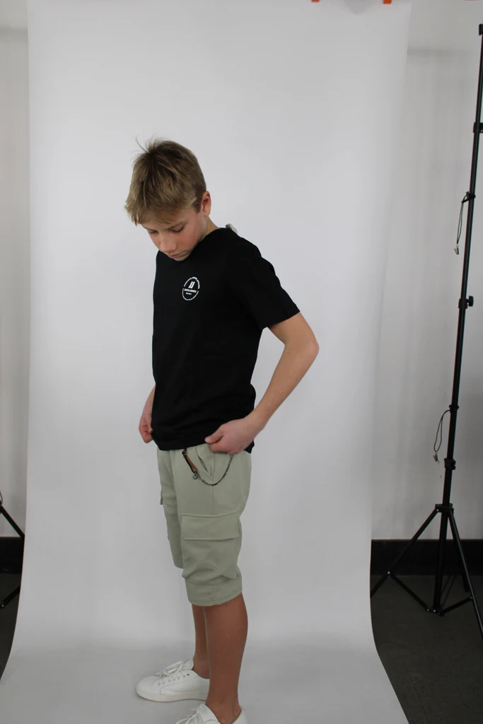 Pantaloncini da bambino con tasconi, catenella, e elastico in vita con lacci.