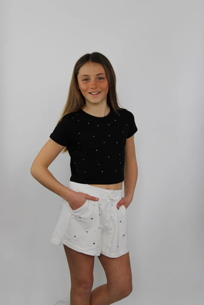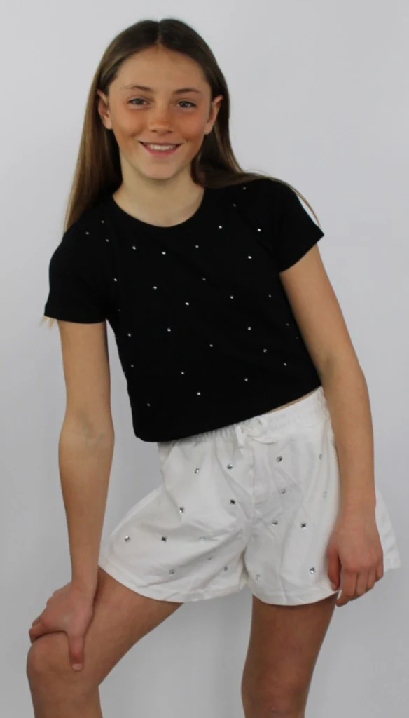 Pantaloncini bianchi da ragazza con decorazioni a piccoli strass argentati distribuiti uniformemente. Modello comodo con vita elasticizzata e coulisse, perfetto per un look estivo fresco e luminoso, da abbinare con top semplici o t-shirt a tinta unita.