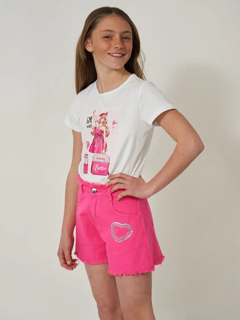 Pantaloncino sfrangiato con cuore di strass su gamba, chiusura zip + bottone e tasche oblique
