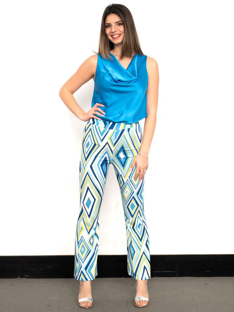 Pantalone con vita regolare in fantasia geometrica. Chiusura zip laterale e gamba a zampa