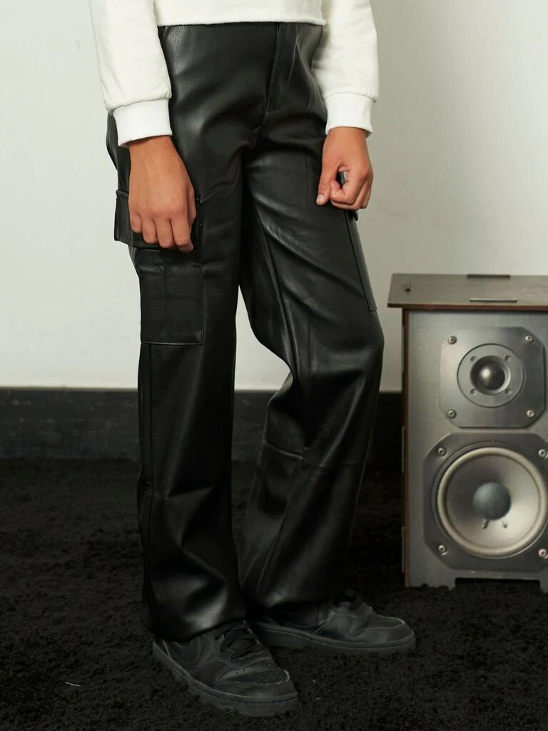 Pantalone in ecopelle con tasche oblique e tasconi su gambe. Chiusura bottone e zip