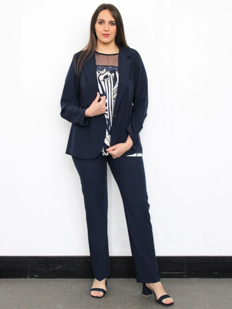 DESCRIZIONEPantalone in tinta unita con chiusura bottone e zip. Tasche america e passantiComposizione: 70% poliestere, 25% viscosa, 5% elastanCodice prodotto: 243774 La modella indossa una taglia 47 conformata