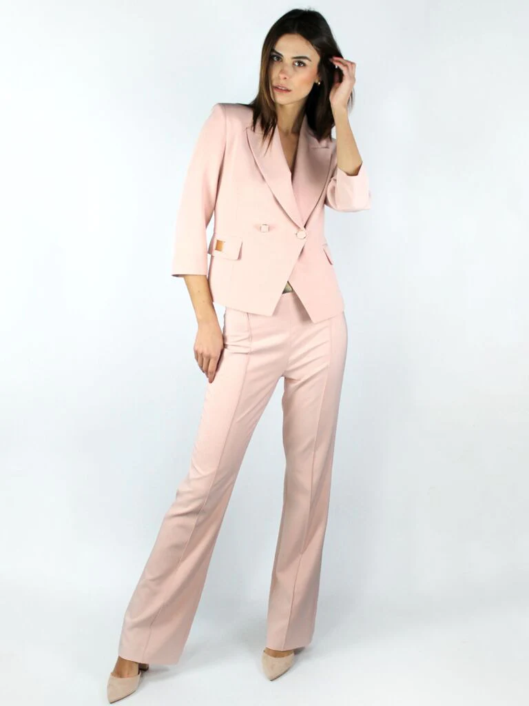 DESCRIZIONE:Pantalone liscio a gamba dritta, cuciture davanti e gioiello applicato in vitaComposizione: 88% poliestere, 12% elastanCodice prodotto: 255445