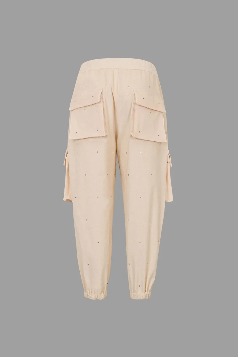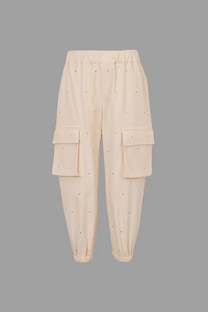 Modello- Pantalone tasconato in velluto panna con strass applicati.