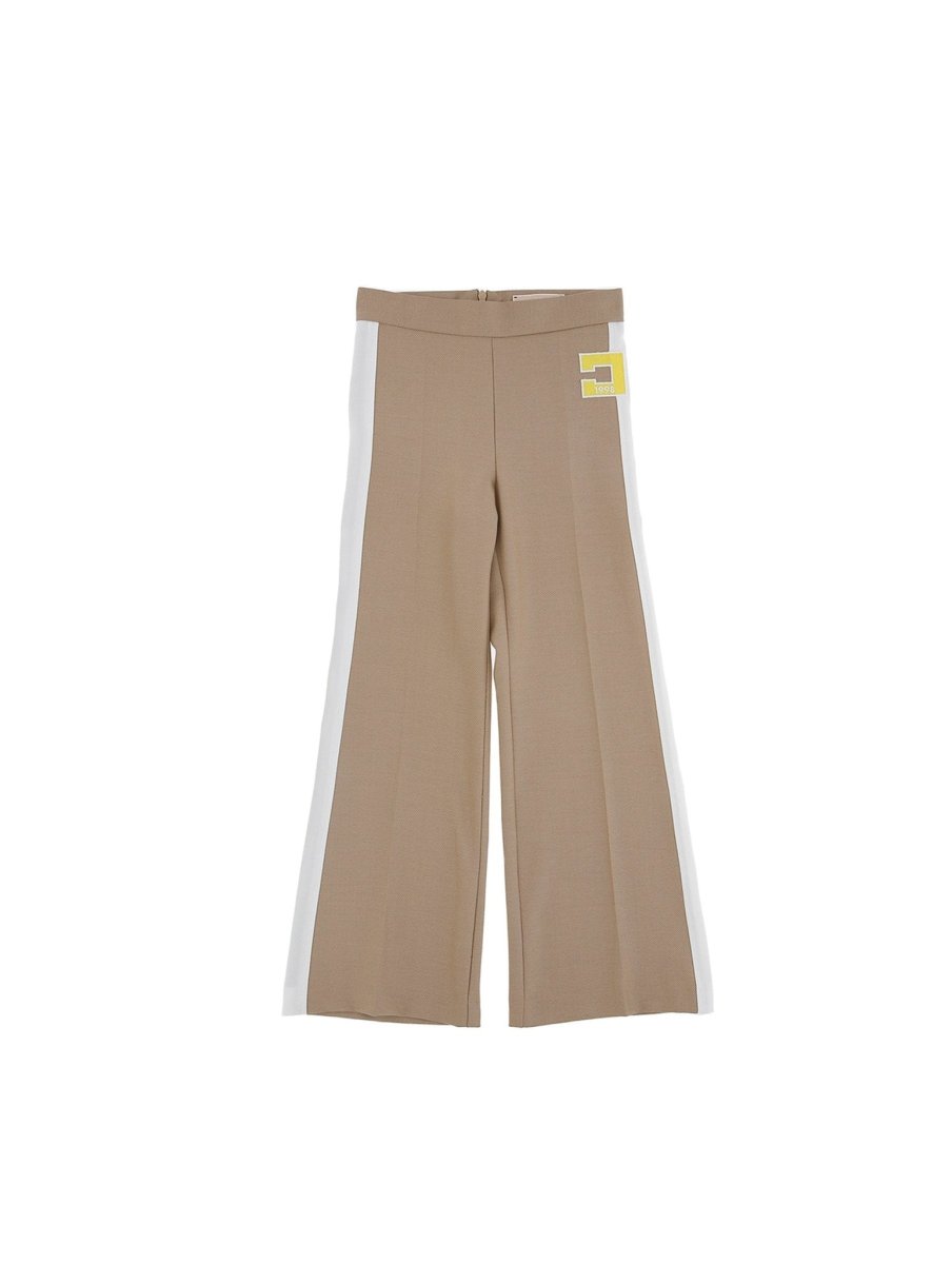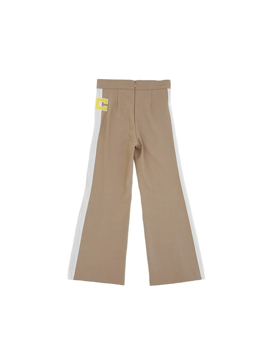 Pantaloni modello palazzo, a tinta unita, con bande laterali a contrasto, piega centrale lungo le gambe, chiusura con zip invisibile sul retro e monogramma del logo ricamato a contrasto sul lato sinistro. Per un look sofisticato ed elegante. ELISABETTA FRANCHI