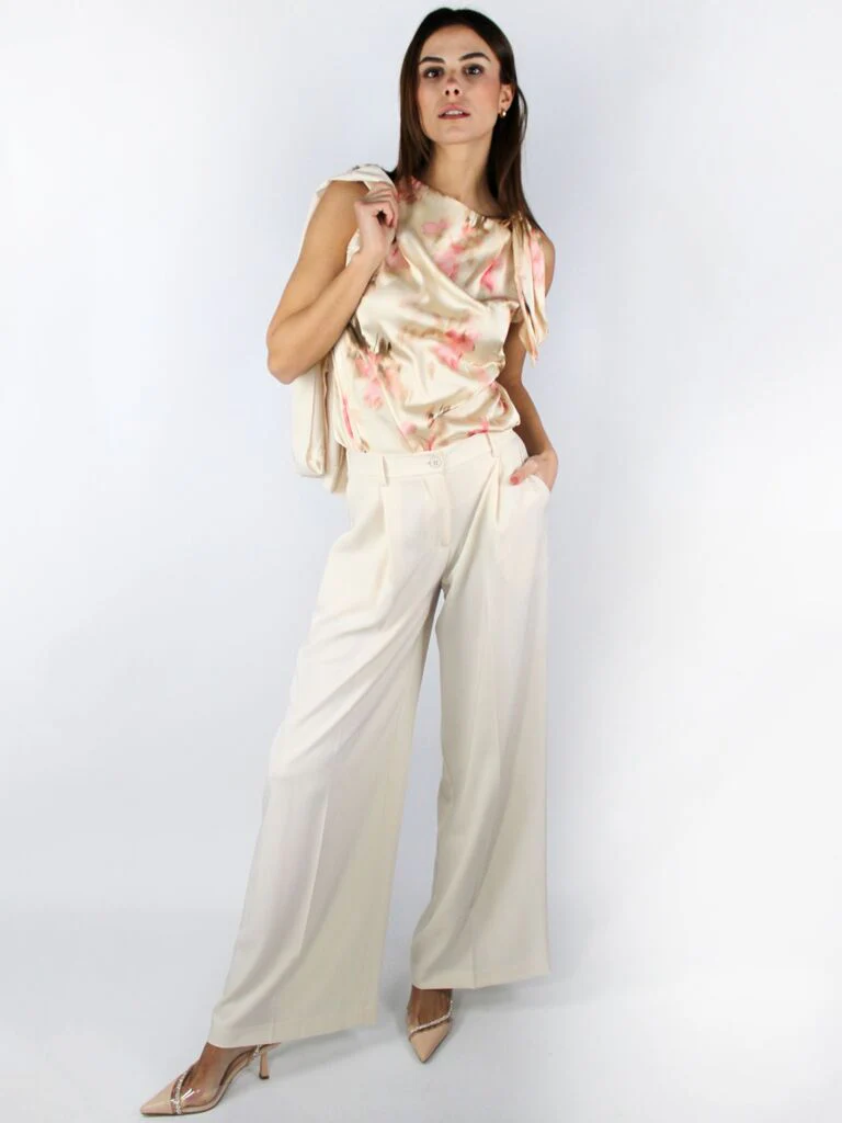 pantalone con tessuto fluido, un bottone, tasche oblique e pinces davanti