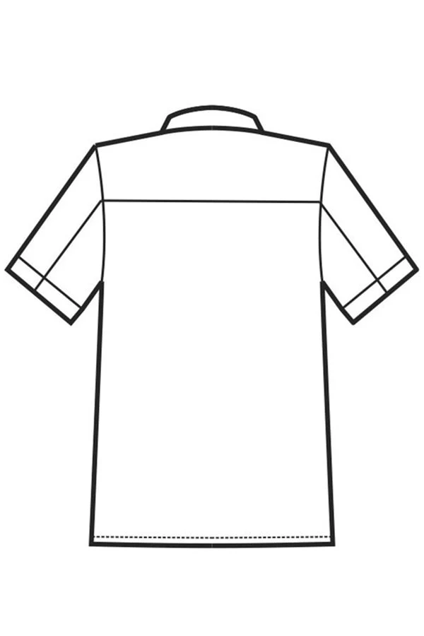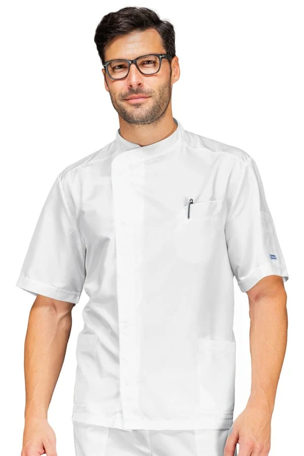 Casacca da Uomo bianca a maniche corte elegante e pratica. Dotata di tre ampie tasche e di chiusura anteriore leggermente laterale con bottoni a pressione nascosti e collo asimmetrico