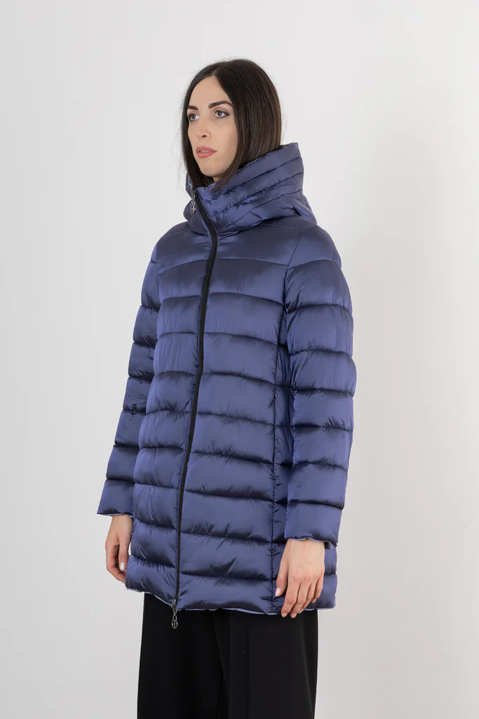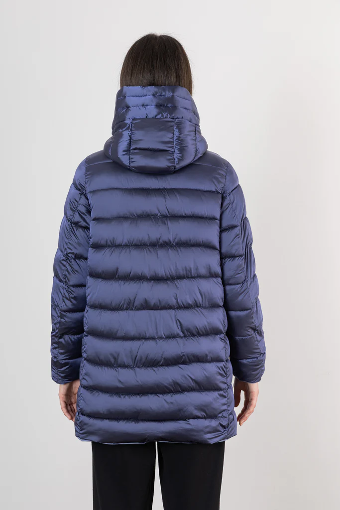 Giacca imbottita trapuntata, modello lungo con chiusura frontale a zip. Dotata di cappuccio fisso e collo alto avvolgente, รจ reversibile, per offrire due look in un unico capo. Calda, pratica e versatile, รจ ideale per affrontare le giornate fredde con stile.