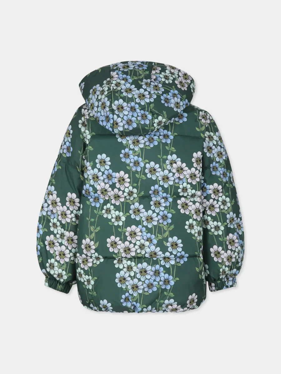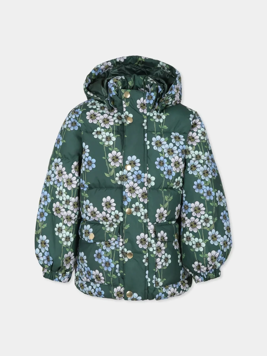 Piumino verde pesante, impermeabile, imbottito e trapuntato, a maniche lunghe, con cappuccio removibile, chiusura frontale con zip e bottoni automatici, tasche con patta e bottone sul davanti, polsini elasticizzati. รˆ decorato con stampa margherite all-over e patch logato sul lato. Questo capo รฉ realizzato con poliestere riciclato. Composizione: 100%poliestere Riciclato