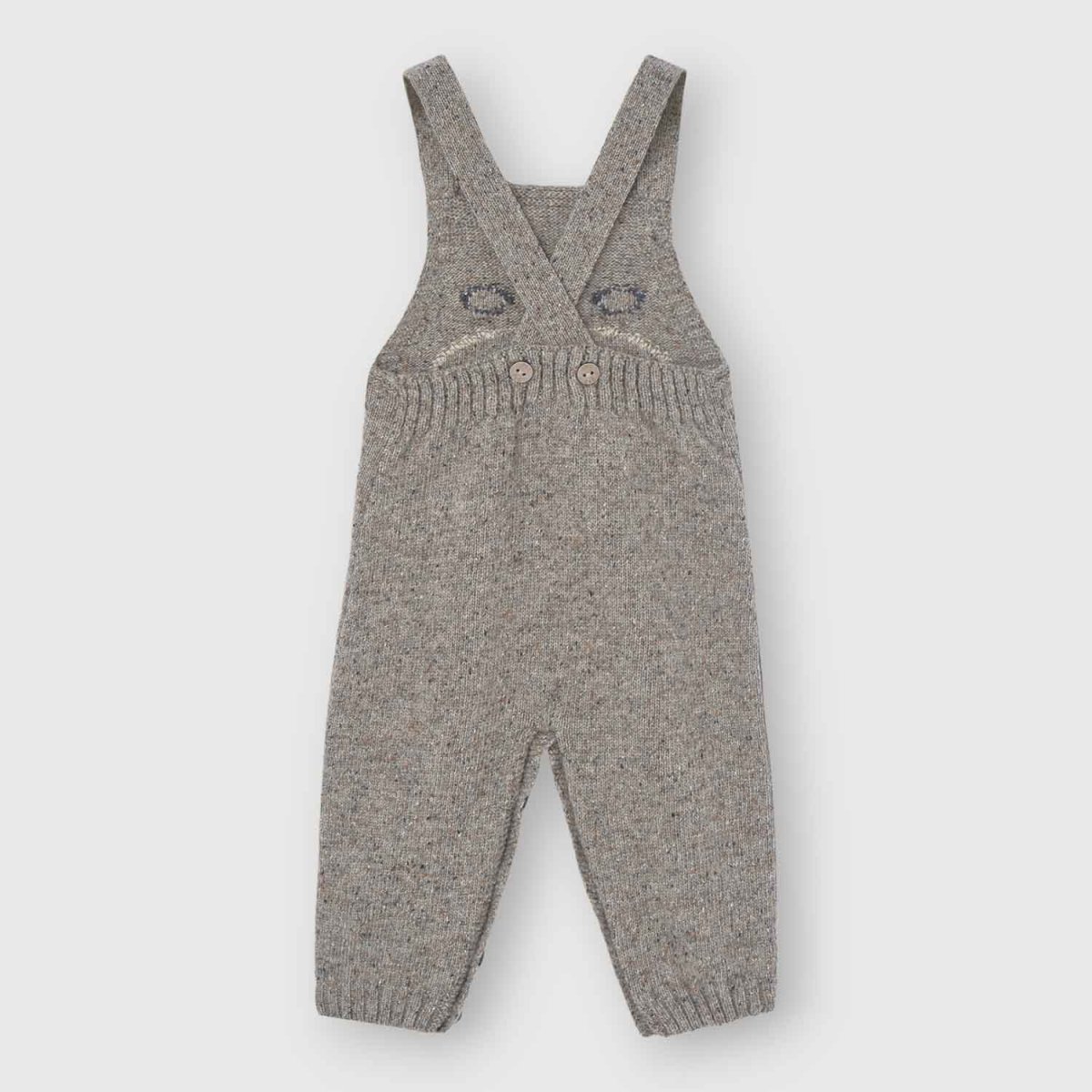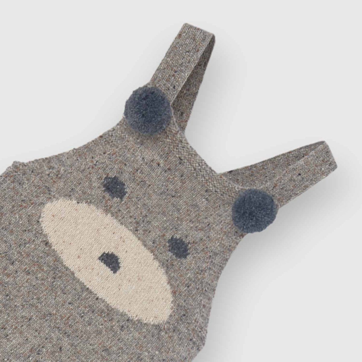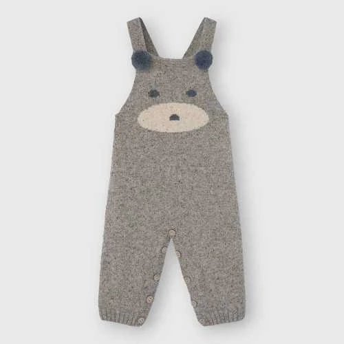Salopette per bambini in maglia mรฉlange con scollo rotondo e bretelle decorate con pompon sulla parte anteriore. Le bretelle sono regolabili con un bottone sul retro. Presenta un incantevole motivo jacquard di un orsetto nella parte anteriore. Finita con polsino in basso. Dispone di un’apertura nel cavallo con bottoni coordinati, che facilita il cambio del pannolino.