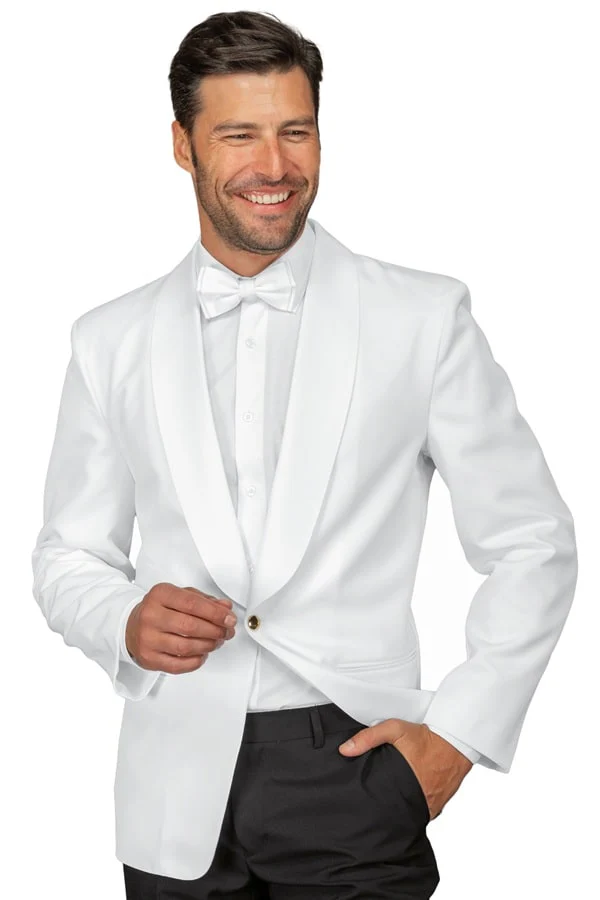 Elegante giacca da uomo monopetto con 1 bottone di chiusura. Con ampio collo a scialle รจ realizzata in tessuto sintetico, resistente e stirofacile. Concepita per utilizzi continuativi in ambiti di rappresentanza e reception.