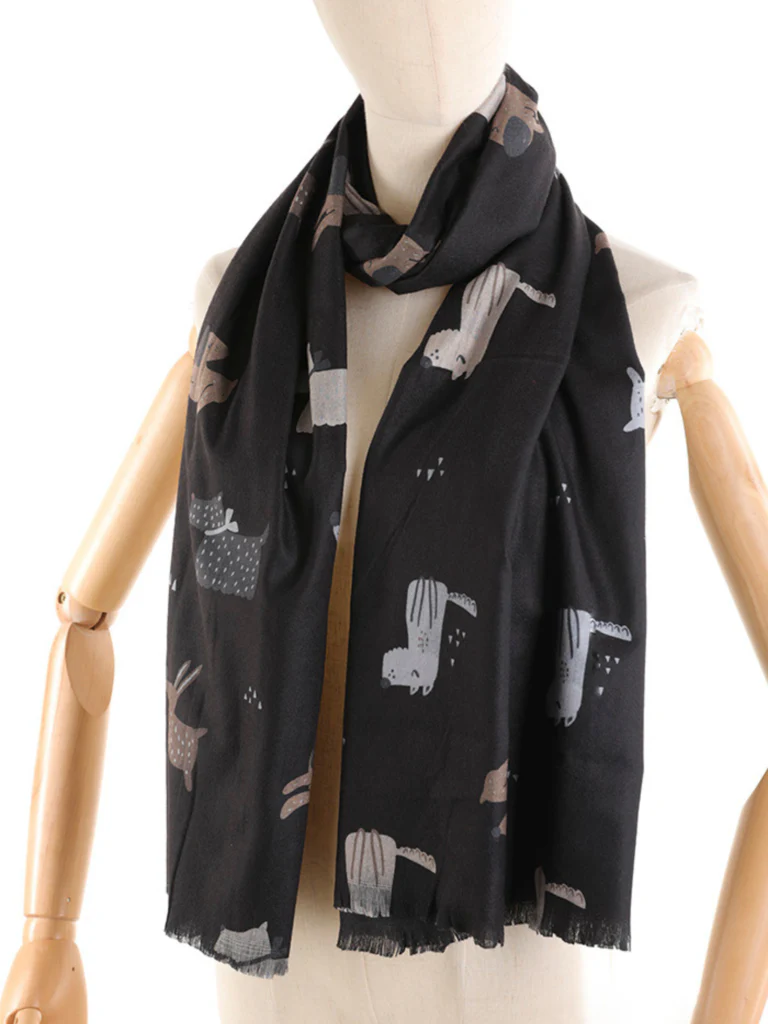 Questa sciarpa presenta una base in tinta unita decorata con simpatici cani stilizzati in stampa all over. Morbida e leggera, con piccole frange sul bordo, รจ lโaccessorio ideale per aggiungere un tocco giocoso e personale ai tuoi outfit quotidiani. Disponibile in diverse varianti colore.