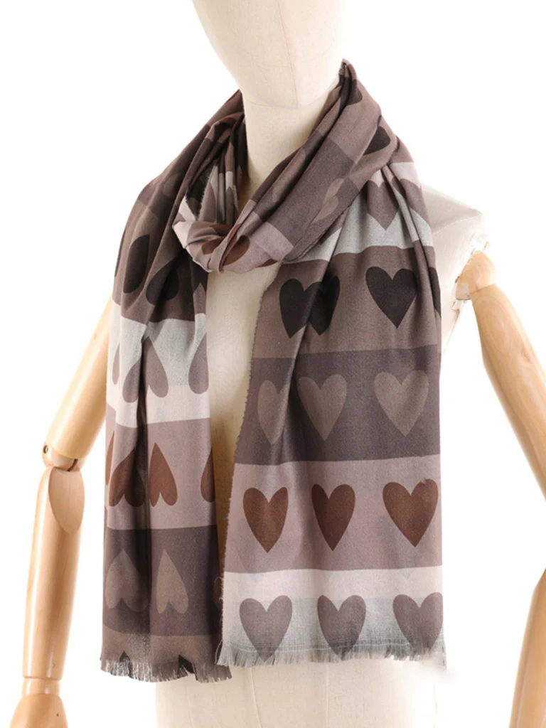 Questa sciarpa presenta una stampa di cuori stilizzati disposti su fasce orizzontali a righe. Morbida e leggera, con piccole frange sul bordo, รจ lโaccessorio ideale per aggiungere un tocco femminile e giocoso ai tuoi outfit quotidiani.