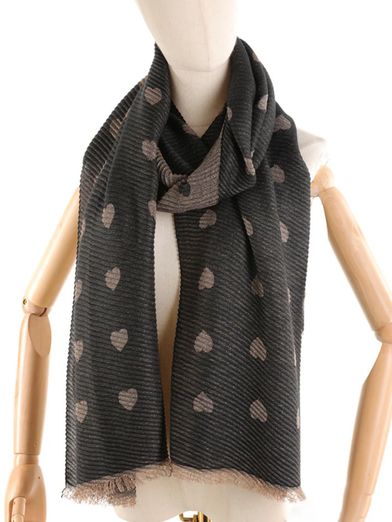 Questa sciarpa presenta una base in tinta unita arricchita da un delicato motivo a cuori. Leggera ma calda, con finitura a piccole frange sul bordo, รจ lโ€™accessorio ideale per aggiungere un tocco romantico e versatile ai tuoi look quotidiani. Disponibile in diverse varianti colore per adattarsi a ogni stile.