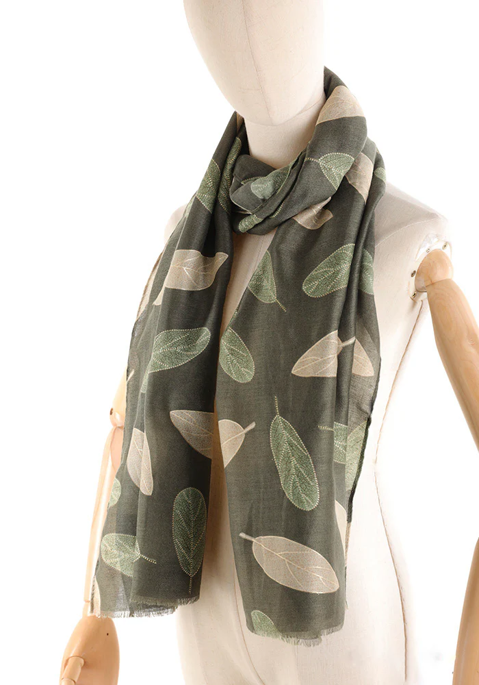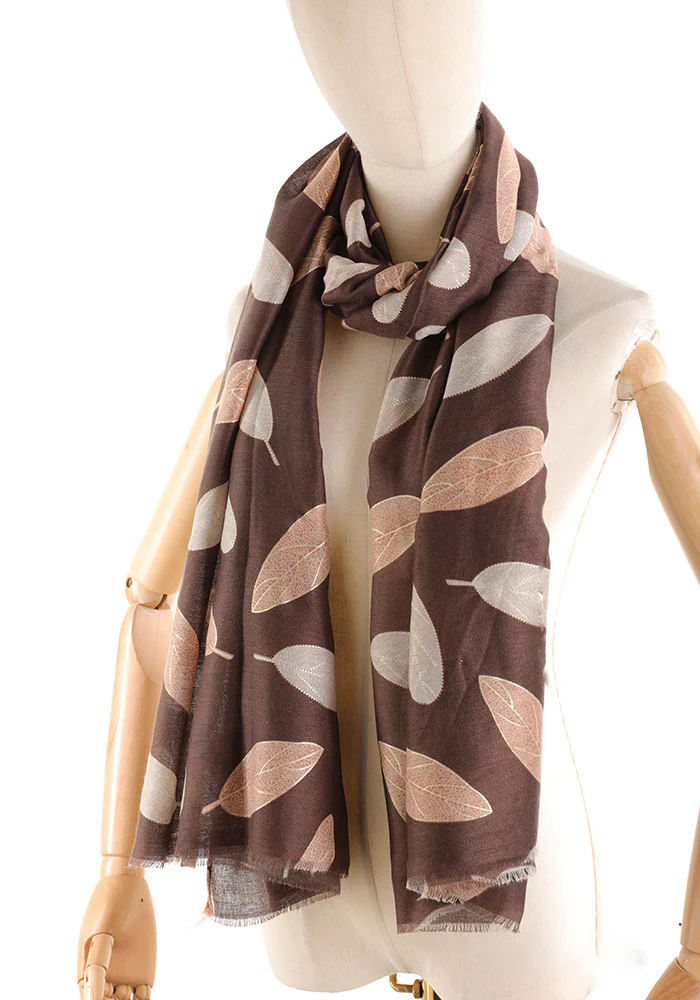 Sciarpa donna leggera e morbida, caratterizzata da una raffinata fantasia a foglie. Un accessorio elegante e versatile, perfetto per illuminare i tuoi outfit quotidiani con un tocco naturale e ricercato.Il tessuto fluido e piacevole al tatto la rende ideale da indossare in ogni stagione, mentre le estremità leggermente sfrangiate aggiungono un dettaglio moderno e delicato.
