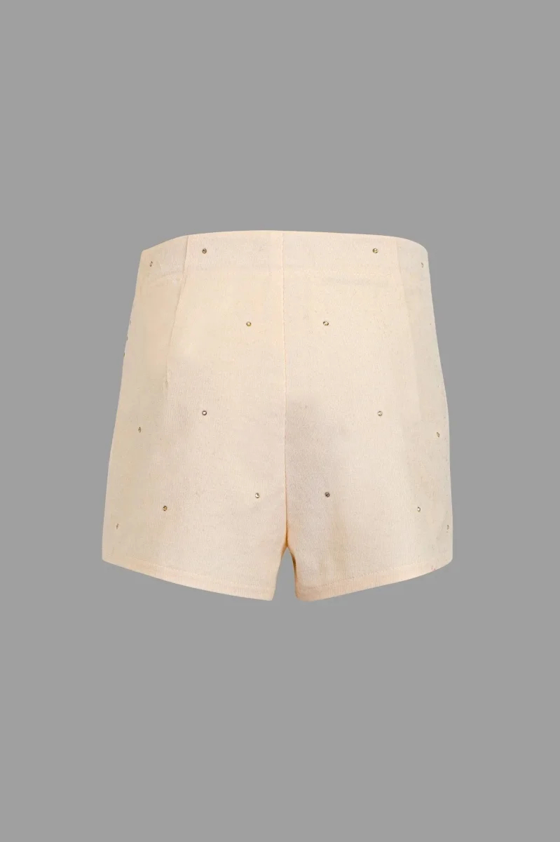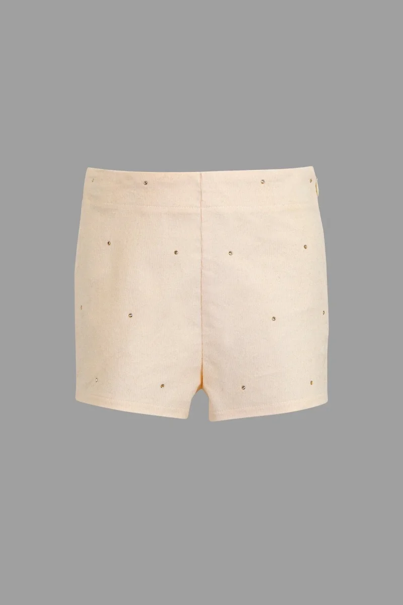 L’eleganza รจ fatta di piccoli gentili dettagli e tessuti preziosi per i look piรน chic. Colore- PannaModello- Short ADERENTE in velluto con strass Composizione-97% cotone 3% elastan