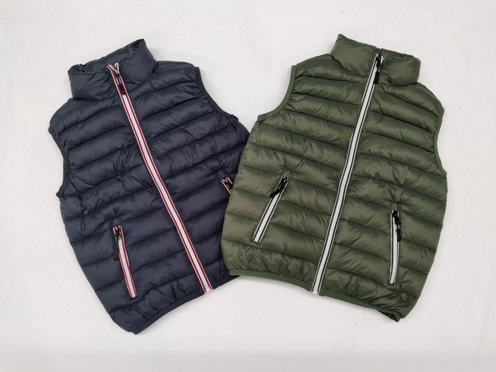 Smanicato da bambino, due tasche laterali con la zip, zip centrate, tutte in contrasto con il giubbotto. Elastico in vita e altezza spalle.