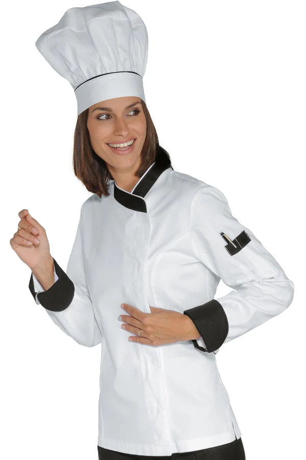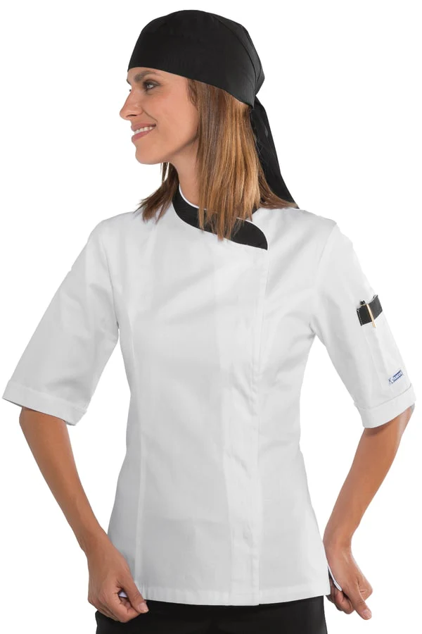 Splendida giacca cuoca molto leggera e pratica. Apertura con bottoni a pressione laterali, รจ sfiancata e dotata di un pratico taschino sull’avambraccio nonchรฉ di spacchetti laterali per agevolare il movimento. Realizzata in due varianti di colore.