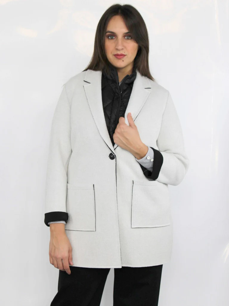 Spolverino taglio vivo in tessuto accoppiato, chiusura con un bottone, tasche applicate a toppa e rever.