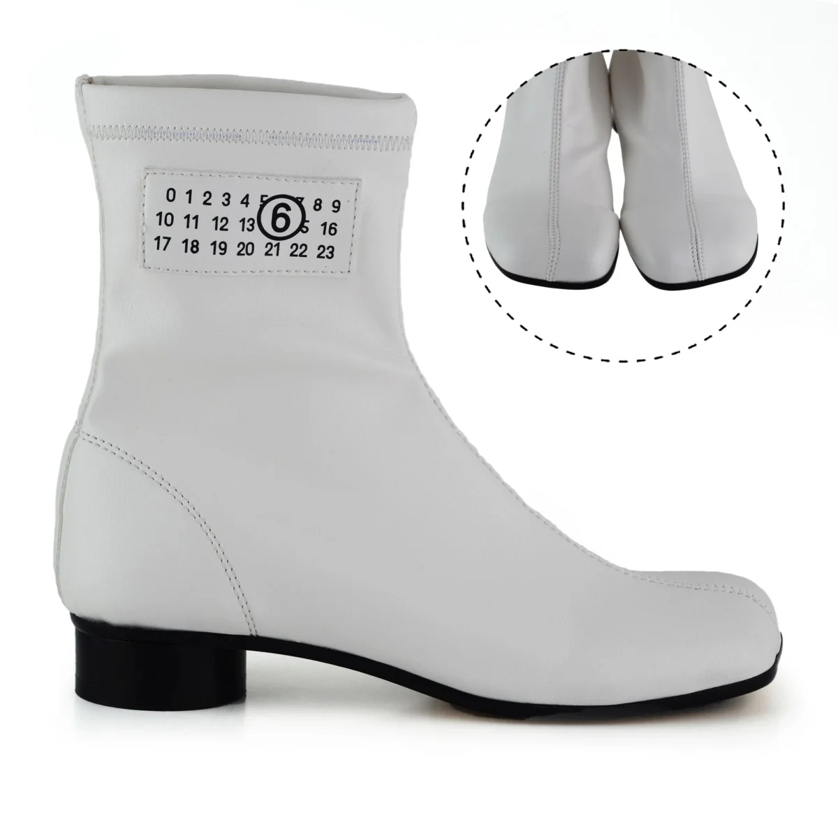 bianco grana liscia cuciture decorativa punta quadrata suola in pelle tacco largo basso lunghezza alla caviglia