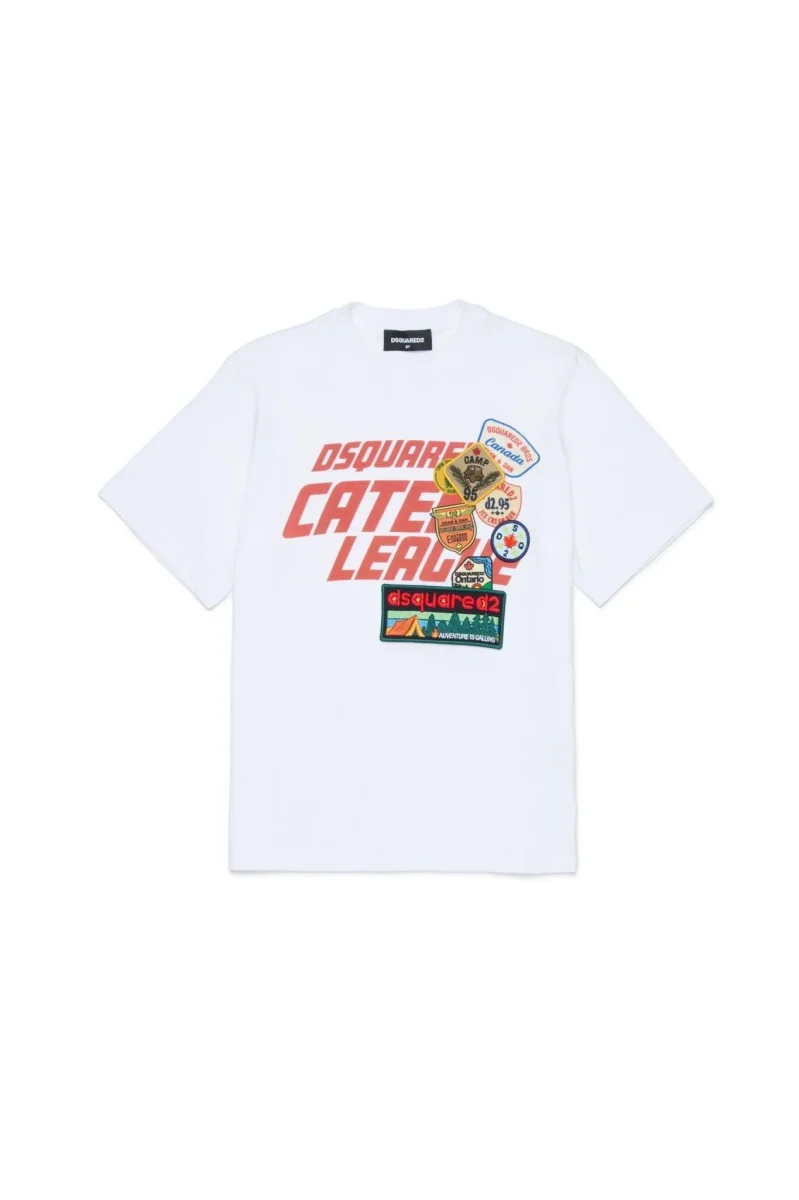T-shirt in 100% cotone con logo applicato e patch sul davanti, perfetta per aggiungere un tocco grafico e distintivo al tuo outfit. Girocollo Maniche corte Logo Dsquared2 e patch applicati sul petto Realizzato in cotone al 100% Vestibilitร ampia