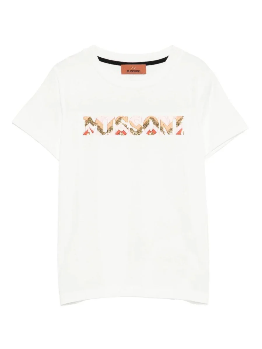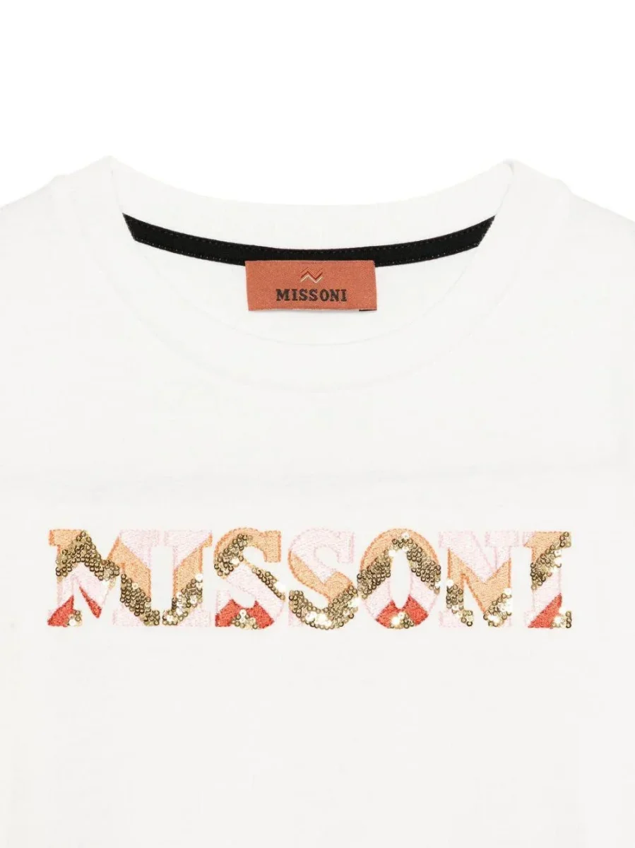 T-shirt per bambina Missoni Kids bianco con logo di paillettes Realizzato in cotone 100%, poliestere 100%. Il prodotto presenta un colore bianco, decorazione con paillettes, maniche corte, scollo rotondo, dettaglio logo, cotone.