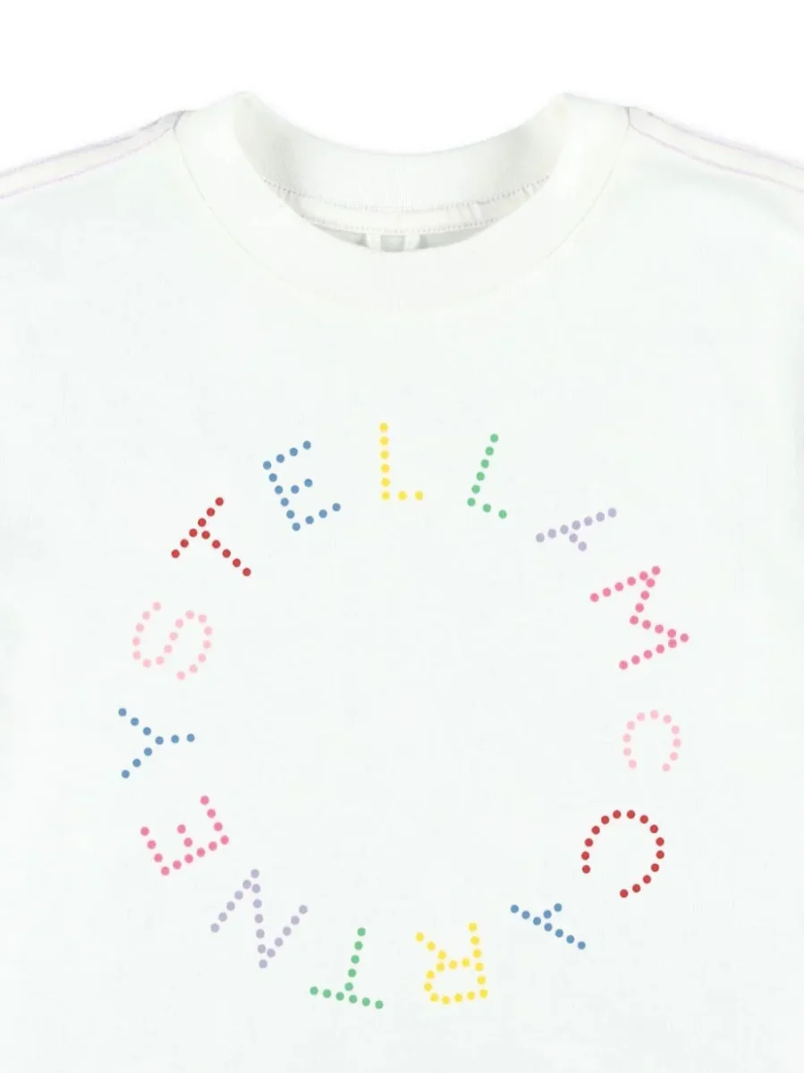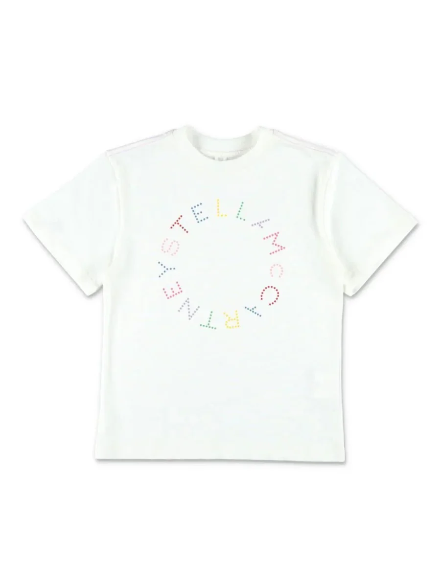 Il prodotto Stella McCartney Kids T-shirt in cotone stampato รจ realizzato in Cotone 100%. La maglietta presenta una stampa logo in cotone bianco, scollo rotondo, maniche corte, orlo dritto.