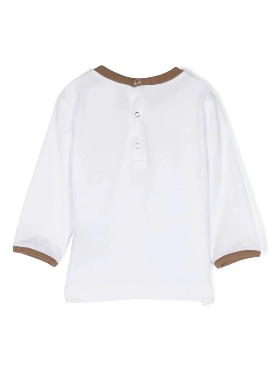 T-shirt con stampa bianco, caffรจ, cotone, stampa con logo sul davanti, bordo a contrasto, scollo rotondo, chiusura posteriore con bottone a pressione, maniche lunghe e orlo dritto.