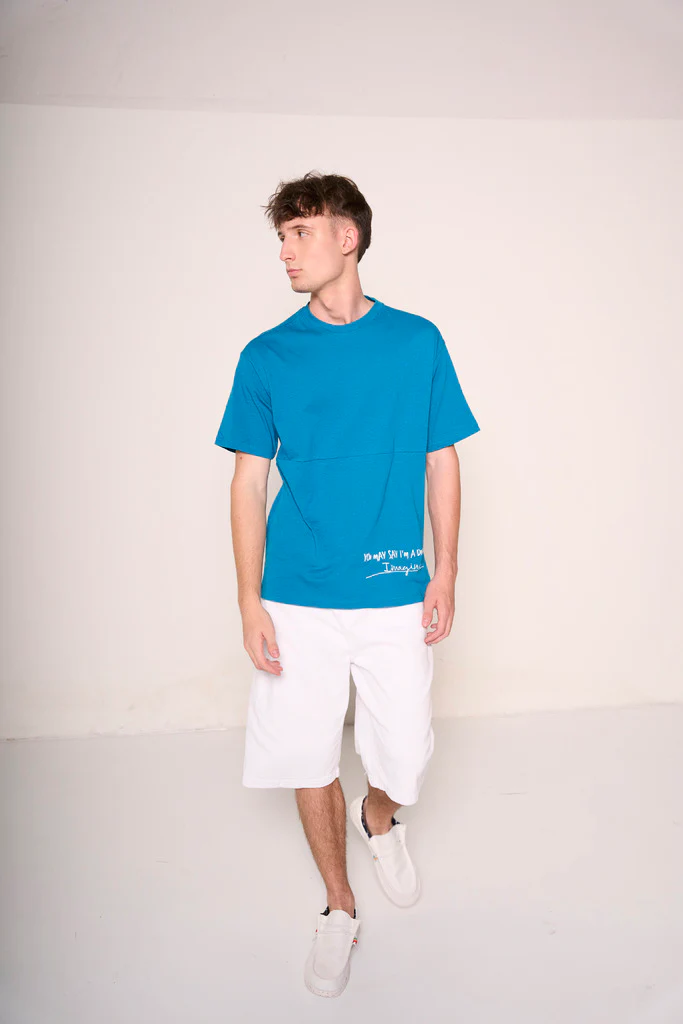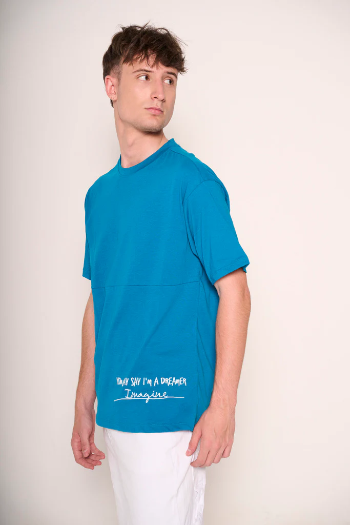 Questa t-shirt ottanio รจ il perfetto mix di semplicitร e personalitร . Realizzata in cotone morbido e traspirante, offre un comfort eccezionale per tutta la giornata. Il dettaglio testuale stampato sul lato inferiore, aggiunge un tocco di originalitร e carattere. Ideale da abbinare a jeans o bermuda per un look casual ma di impatto.