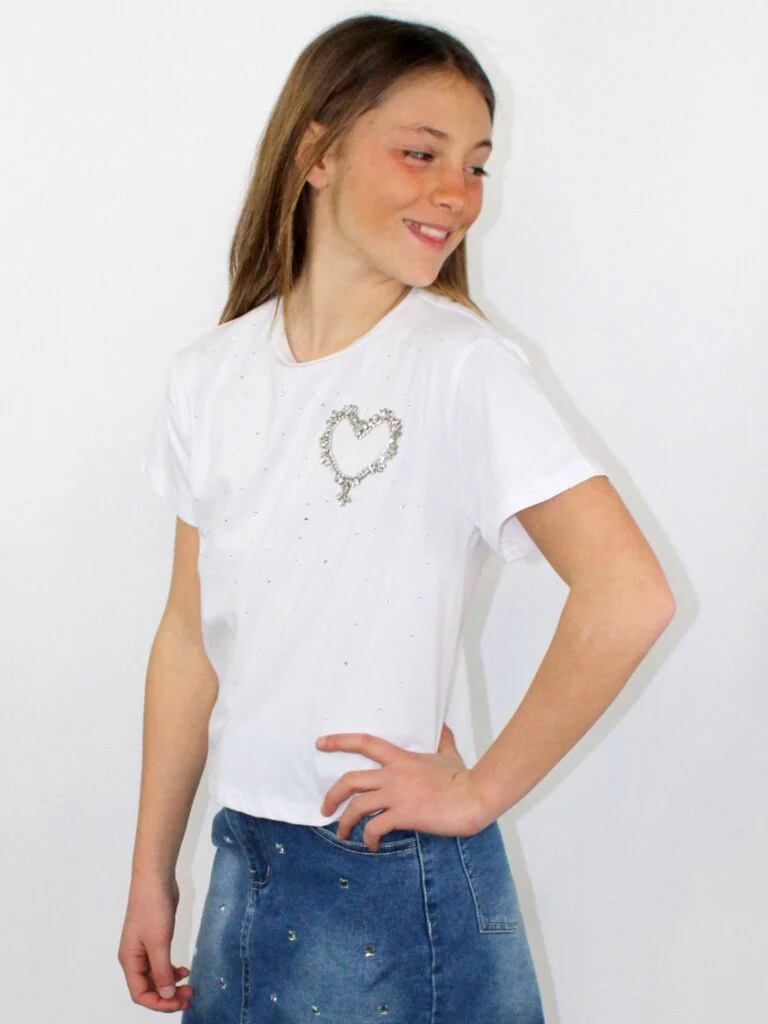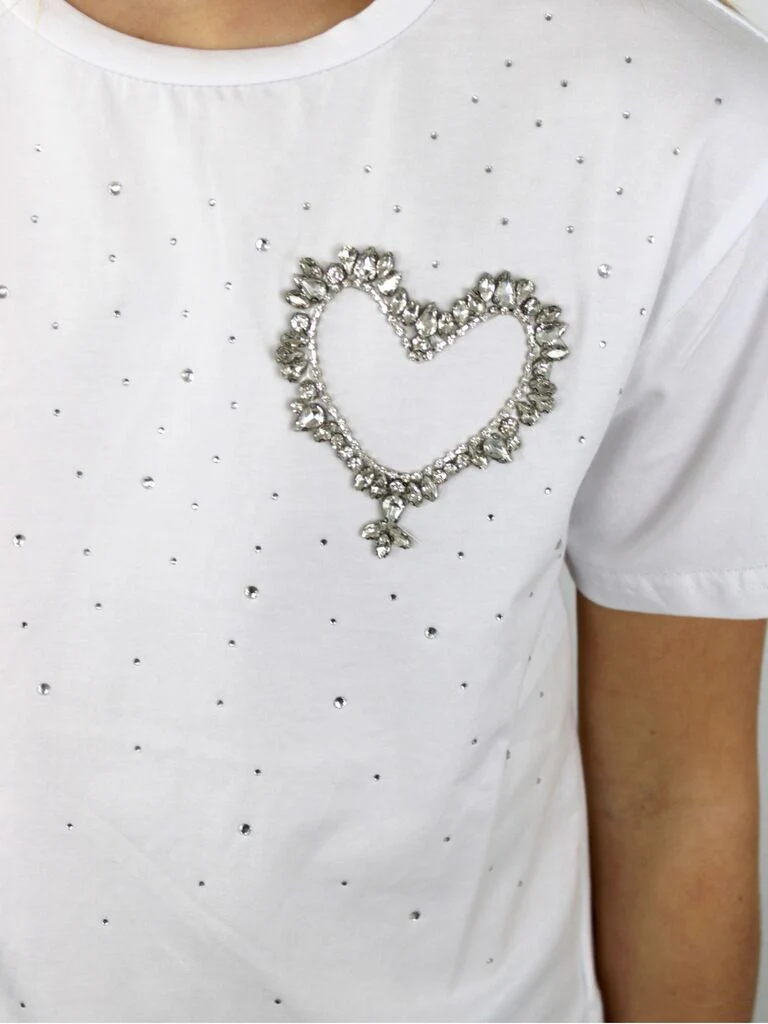 T.shirt con brillantini e cuore di strass sul petto