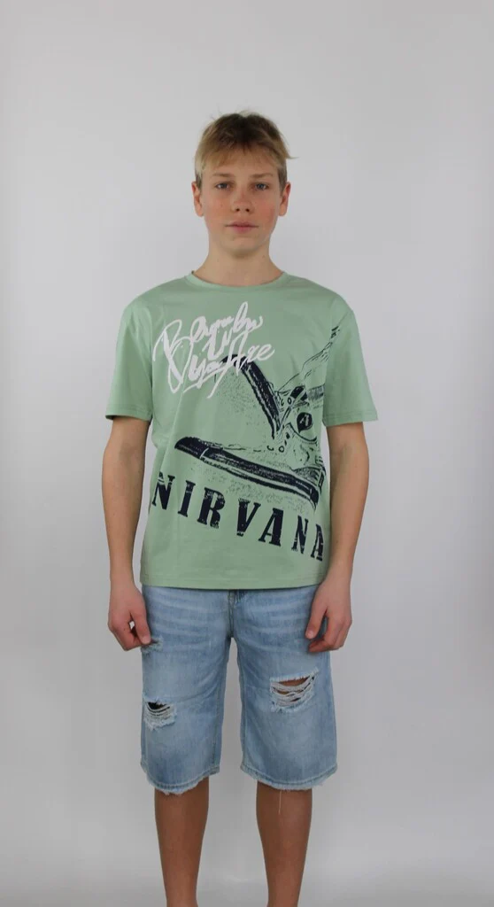 T-shirt da ragazzo in cotone verde salvia, dal taglio regular e dallo stile streetwear. Sul davanti presenta una stampa grafica in stile illustrato raffigurante una sneaker, accompagnata dalla scritta “NIRVANA” in caratteri maiuscoli neri e da un lettering bianco piรน dinamico nella parte superiore. La maglia unisce elementi urban e musicali, perfetta per un look casual e deciso.