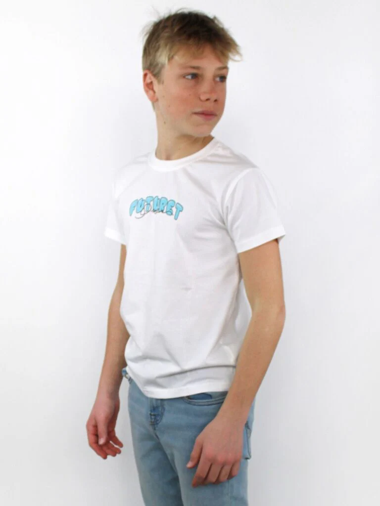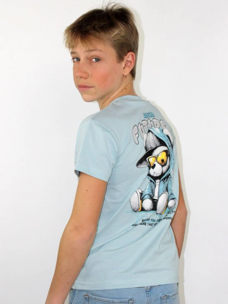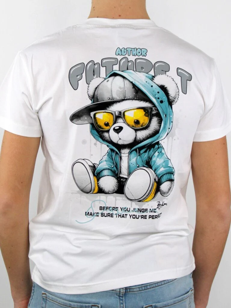 T-shirt con scritta “FutureT” sul petto e stampa orsetto dietro