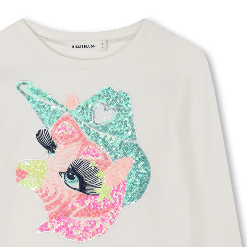 BILLIEBLUSH porta un tocco di magia nella vita di tutti i giorni con questa t-shirt a maniche lunghe in morbido cotone con scollo rotondo. L’elegante illustrazione impreziosita da paillettes sul davanti cattura l’attenzione e dร vita a un look scintillante. Il suo materiale garantisce un comfort duraturo nel tempo, ideale per accompagnare i bambini nei loro giochi, scoperte e risate.