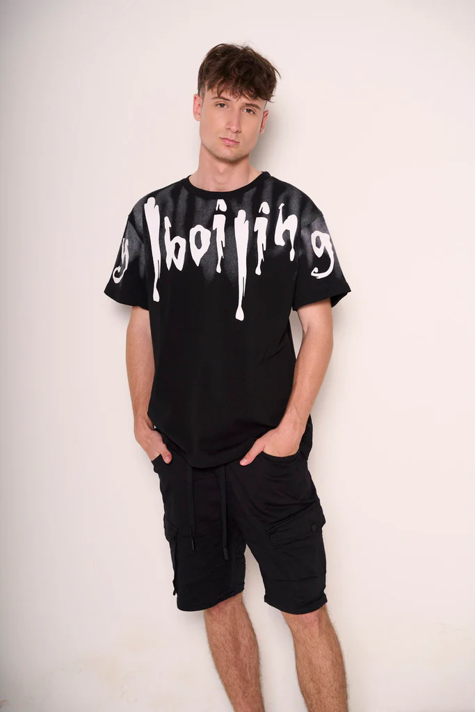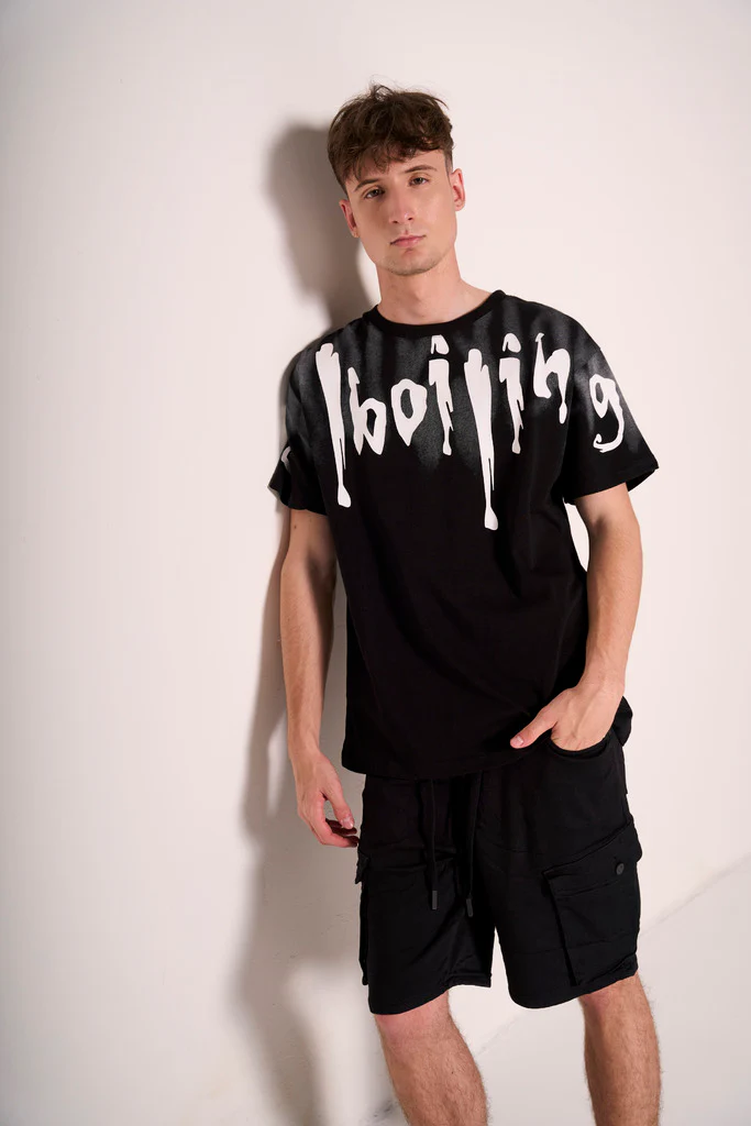 Un look urban deciso con la t-shirt oversize “Boiling”, caratterizzata da una stampa effetto vernice spray in bianco su sfondo nero. Il taglio ampio e la grafica dโimpatto la rendono perfetta per chi ama distinguersi con un tocco streetwear.