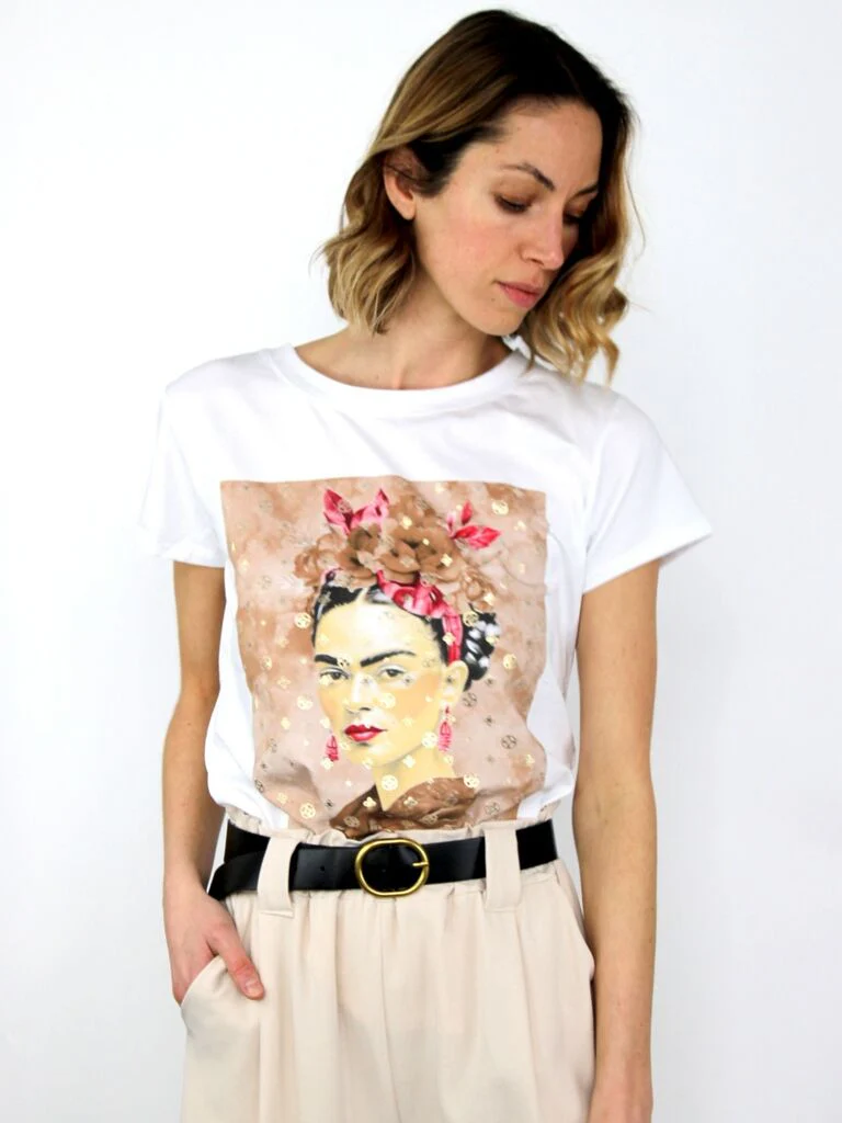 DESCRIZIONE:T-shirt girocollo con stampa FridaComposizione:95% cotone, 5% elastaneCodice prodotto:258269