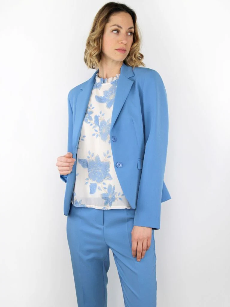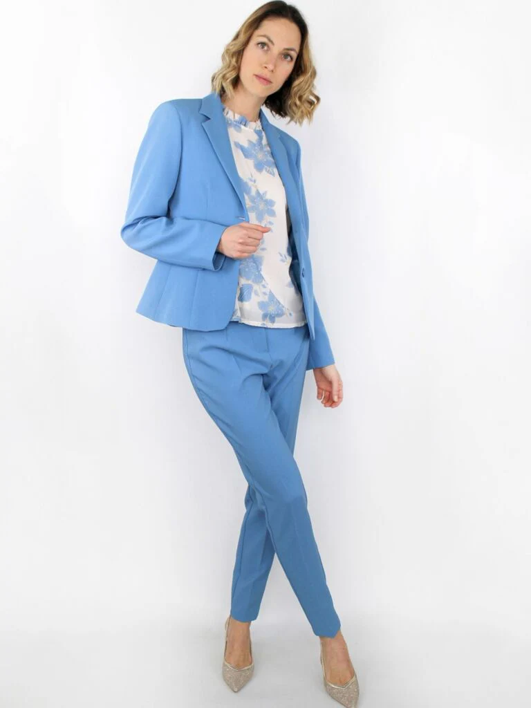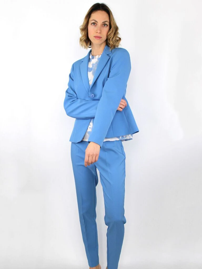 Tailleur due pezzi con giacca a chiusura 2 bottoni e tasche a pattina, pantalone dritto con tasche