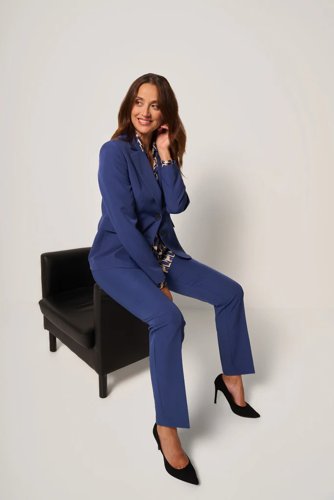 Tailleur da donna composto da giacca monopetto e pantalone dritto, realizzato in tessuto tecnico fluido che garantisce una vestibilitร impeccabile e confortevole. La giacca presenta revers classico, chiusura a due bottoni e tasche con patta, mentre il pantalone dal taglio lineare valorizza la figura con eleganza e semplicitร .