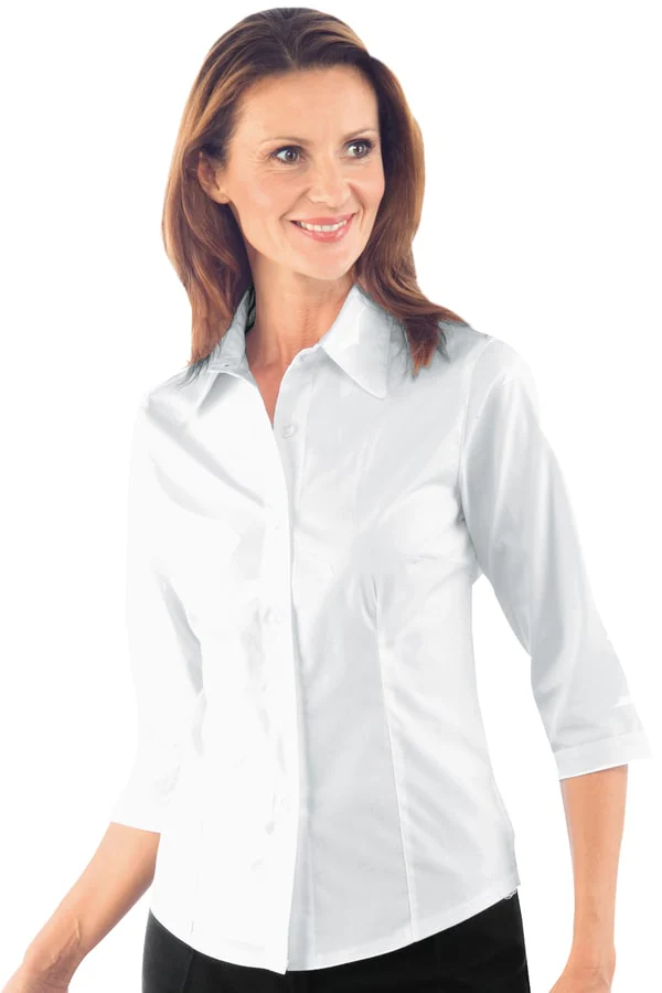 Camicetta Donna sfiancata ed in tessuto leggero leggero di cotone elasticizzato. Colletto leggero. Bottoni visibili tono su tono perlati. Dotata pinces modellanti e di piccoli spacchetti ai fianchi. Disponibile in 3 varianti di manica