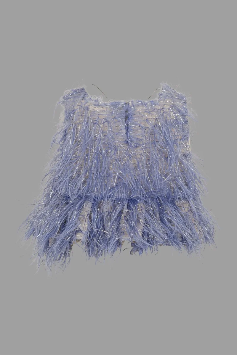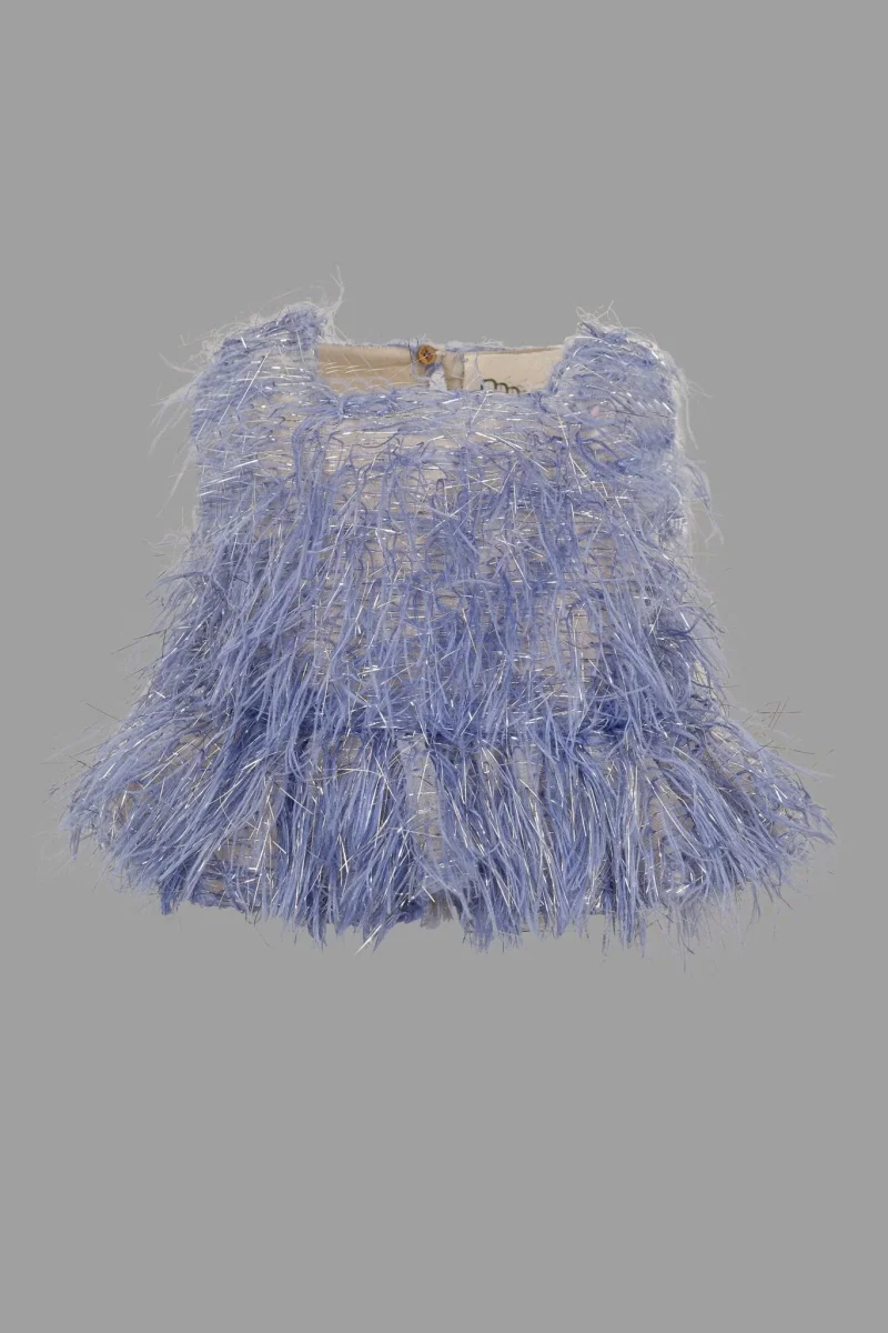 L’eleganza รจ fatta di piccoli gentili dettagli e tessuti preziosi per i look piรน chic.Colore-AzzurroModello- Top in piumette lurex con frappa sul fondo.Composizione : 100% PoliestereFodera 100% Cotone