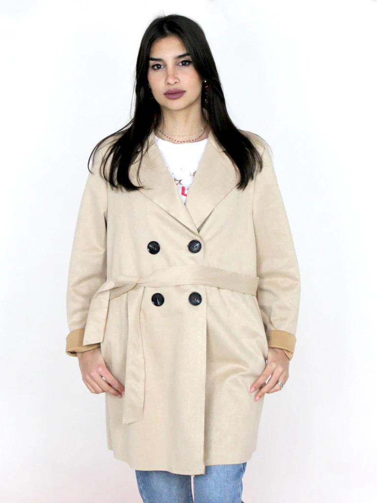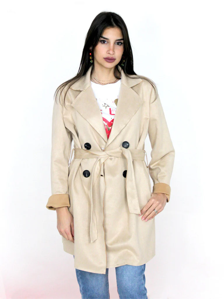DESCRIZIONE:Trench in dainetto, doppiopetto con cintura in tessuto, tasche obliqueComposizione: 92% poliestere, 8% elastanCodice prodotto: 251004