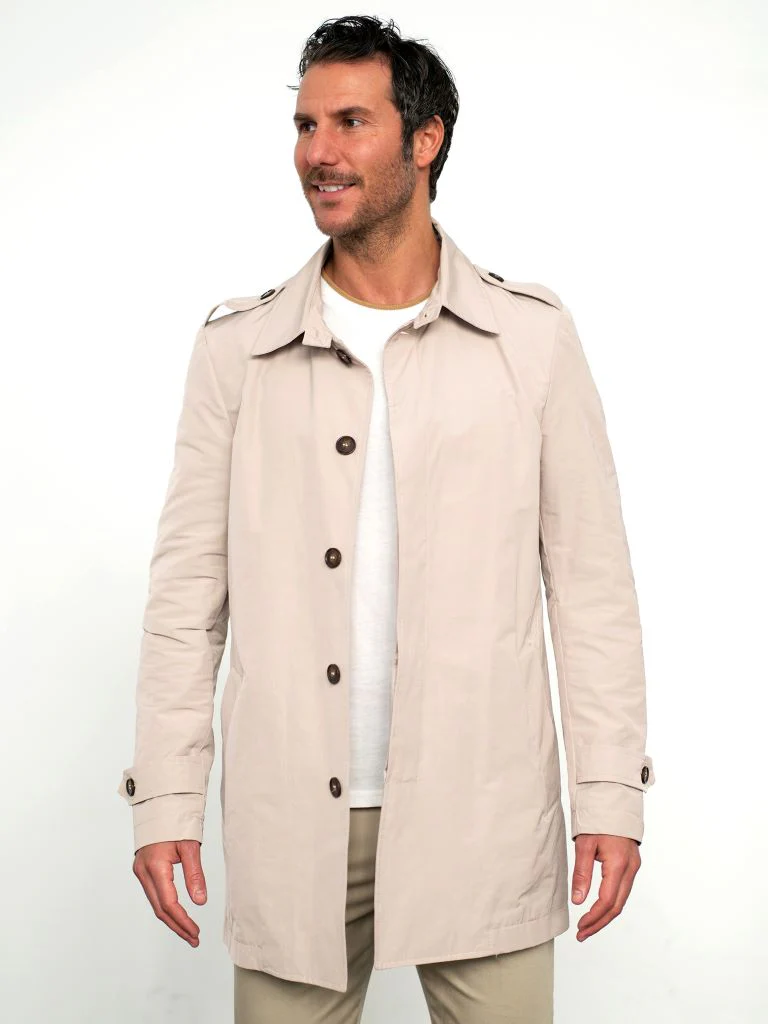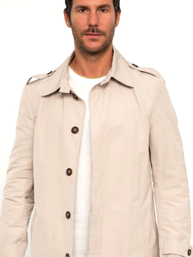 Trench con collo a revers e maniche lunghe. Tasche a filetto sui fianchi e dettaglio di tasca interna. Orlo con spacco centrale posteriore. Chiusura frontale con abbottonatura monopetto.