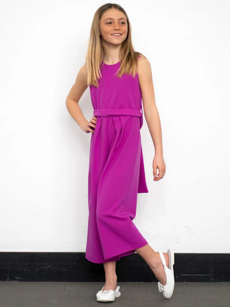 Tuta con collo rotondo e spalline. Dettaglio pinces sulla parte anteriore. Fusciacca in vita tono su tono